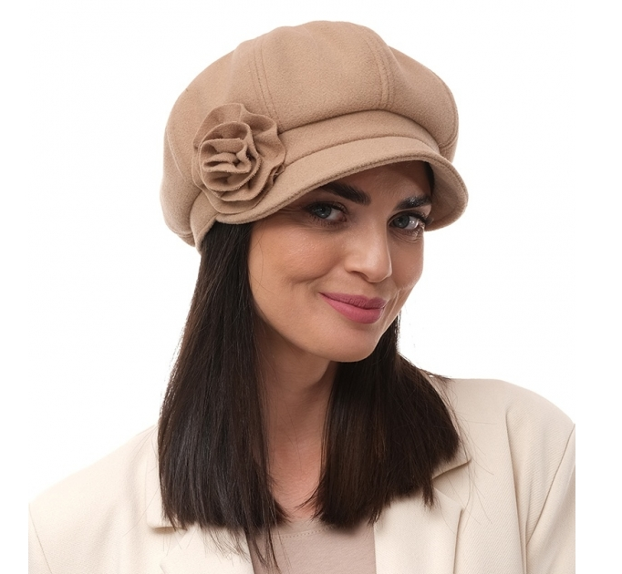 Caciula de dama stil bereta cu cozoroc si floricica 100% lana, marime universala TTS23.03.AP2305 maro Rabionek Polonia