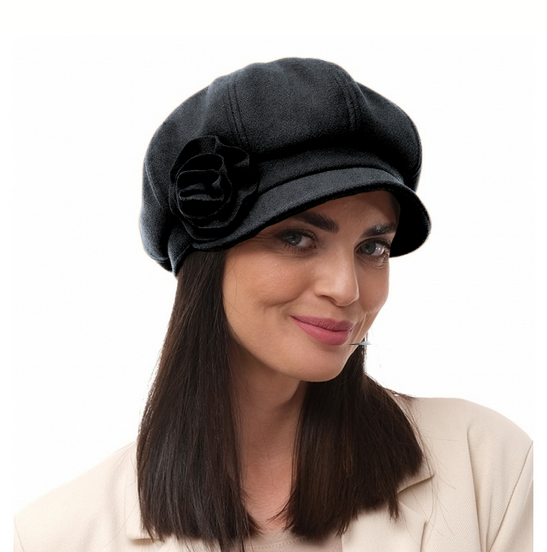Caciula de dama stil bereta cu cozoroc si floricica 100% lana, marime universala TTS23.03.AP2307 NEGRU Rabionek Polonia