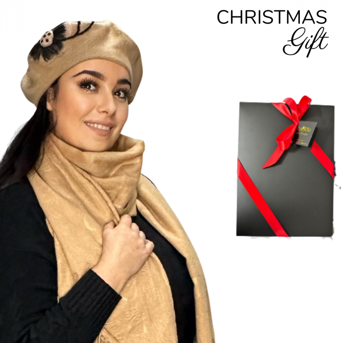 Caciula rafinata de dama cu esarfa asortata din in fire calduroase si placute la atingere