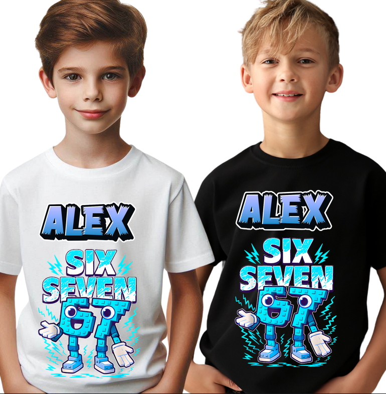 Tricou sau bluză pentru copii, realizată din material moale și confortabil, ideală pentru purtare zilnică. Personalizată cu printul colorat „SIX SEVEN”, oferă un design vesel, modern și plin de energie, pe placul celor mici.