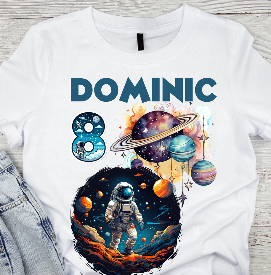Tricoul aniversar cu tematica astronauți captează atenția imediat prin designul său vibrant și plin de culoare. Imaginează-ți copilul îmbrăcat într-un tricou cu un astronaut simpatic plutind printre stele, planete și nave spațiale. Cu detalii bine gândite și o paletă de culori captivantă, acest tricou îi va face pe micii sărbătoriți să se simtă ca adevărați exploratori ai spațiului.
