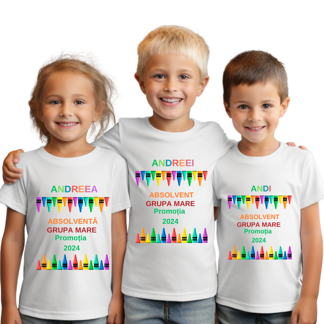 Varietate de opțiuni: Indiferent dacă ești pe cale să absolvești grădinița, școala sau liceul, avem tricouri personalizate pentru fiecare nivel de învățământ. De asemenea, putem personaliza tricouri pentru întreaga clasă sau grupul de prieteni!
