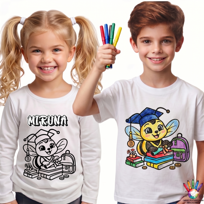 e-CADOU Tricouri de Colorat Clasa Albinutelor – Personalizate Alb-Negru pentru Copii sau Educatoare Activitate Creativa Final de An