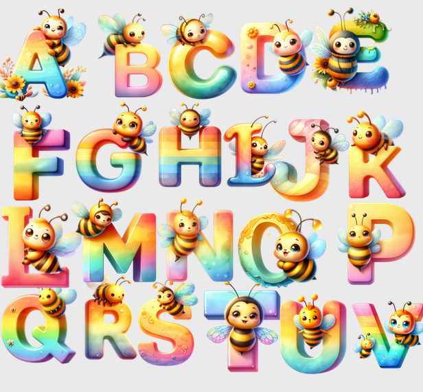 Este un design care integrează literele alfabetului într-o tematică prietenoasă pentru copii, cu elemente vizuale inspirate din lumea albinuțelor.