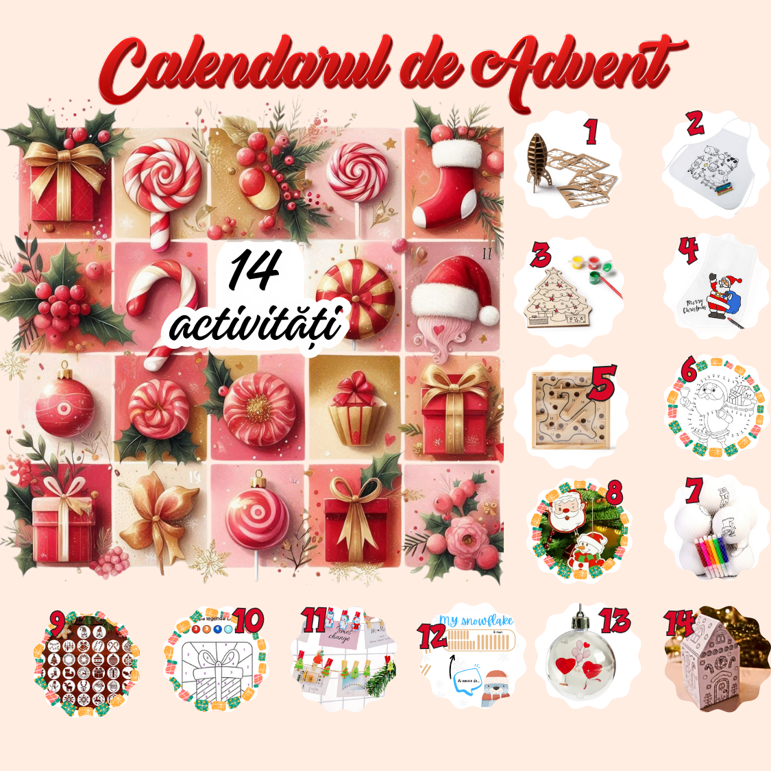 Calendarul de advent - Magia Sărbătorilor de Crăciun cu 14 activități  concepute pentru a stimula imaginația, creativitatea și spiritul sărbătorilor si le gasiti detaliate mai jos; setul este recomandat pentru copii 5–10 ani;