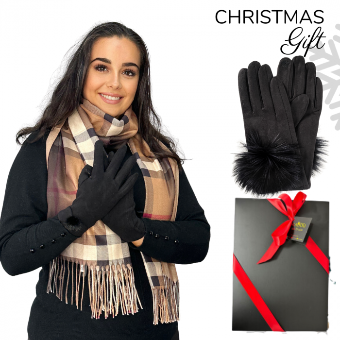 Cadoul perfect de Crăciun - set 2in1 cu manusi si esarfa carouri femei C-5707.03 maro cu puf mare