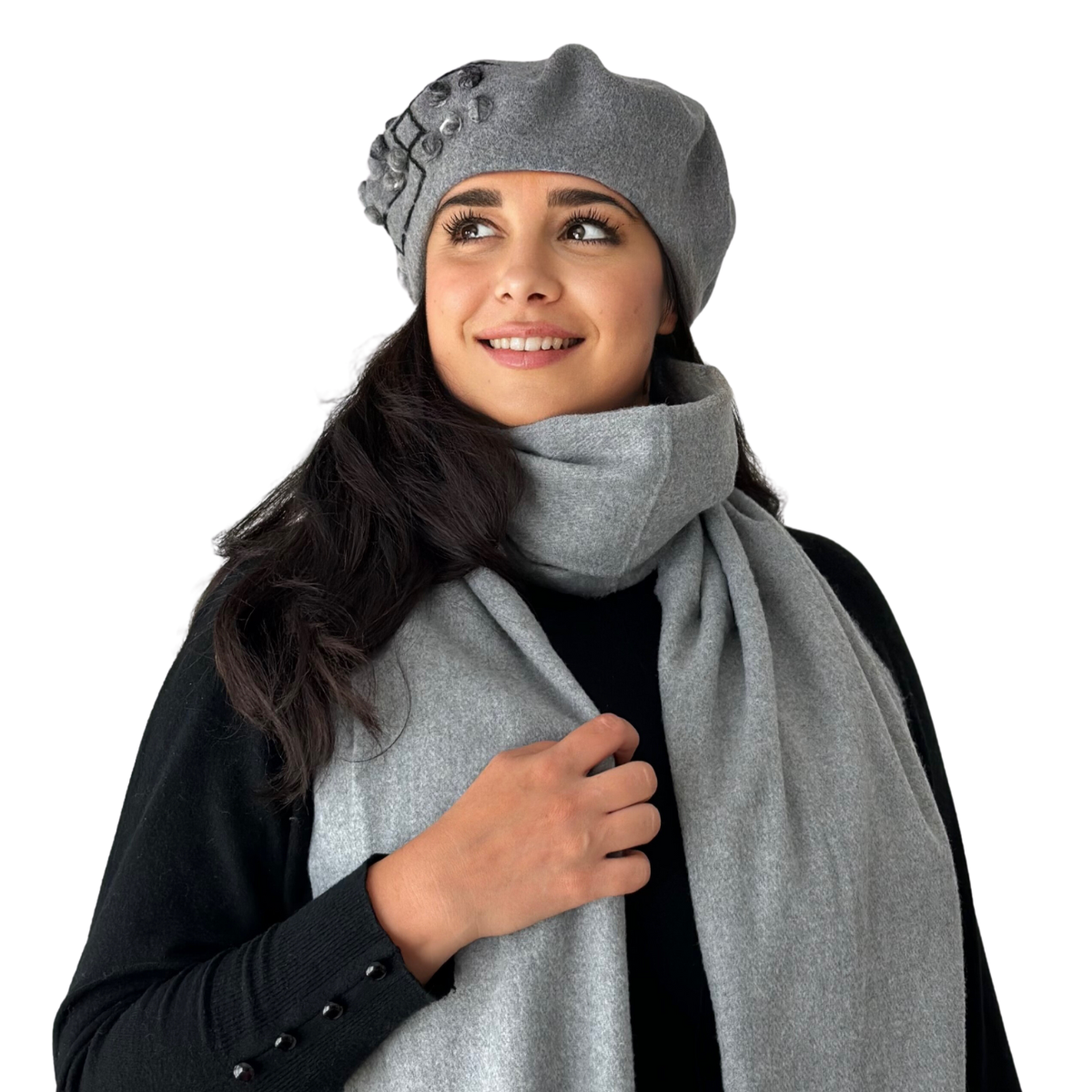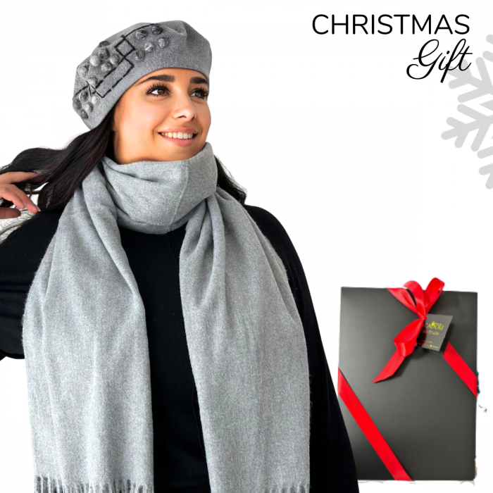 Caciula rafinata de dama cu esarfa asortata din in fire calduroase si placute la atingere