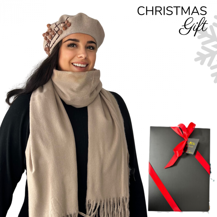 Caciula rafinata de dama cu esarfa asortata din in fire calduroase si placute la atingere