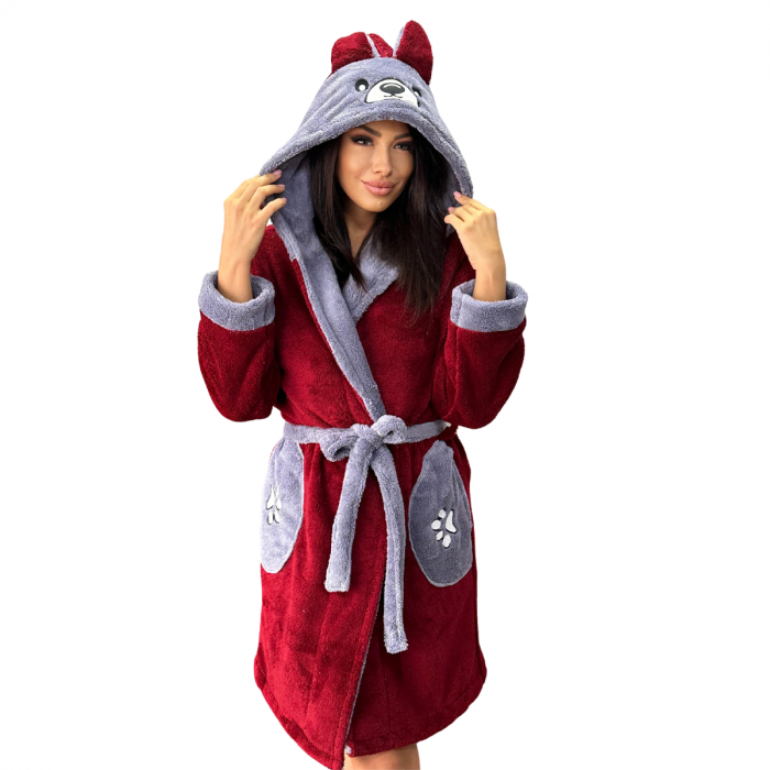 e-CADOU Halat de baie foarte gros cu gluga, buzunare si cordon in talie, visiniu, cu urechi si labute, BAR201V