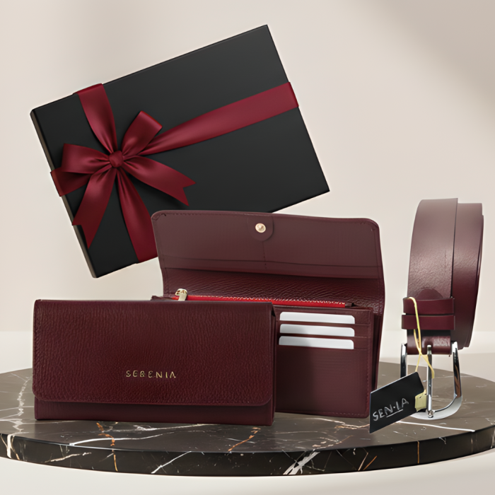 Setul cadou pentru femei este compus dintr-un portofel si o curea, ambalate in cute cadou cu fundita..