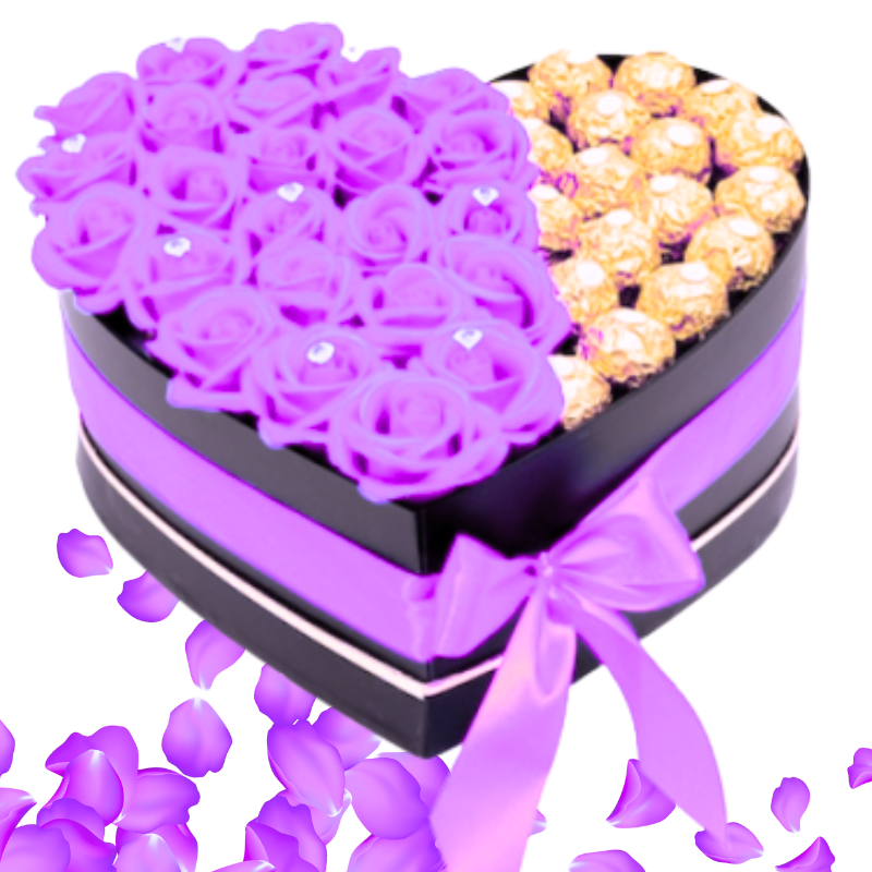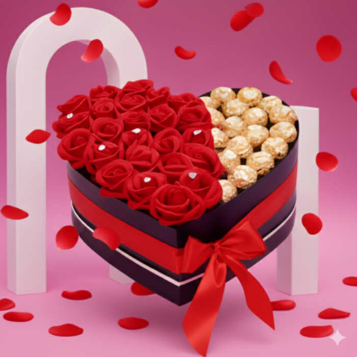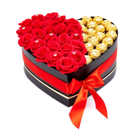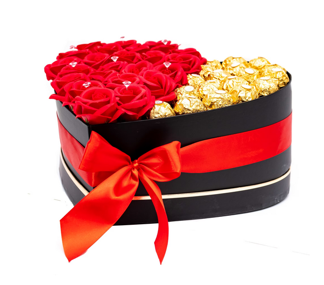 Continut pachet  -  Aranjament floral cu dulciuri in cutie in forma de inima si ciocolata Fererro , acesta contine:
